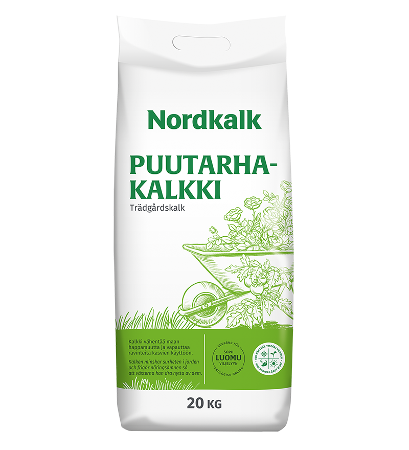 Nordkalk Aito Puutarhakalkki 20 kg /säkki Paras ajankohta kalkitukselle on varhain keväällä ennen kasvukauden alkua tai myöhään syksyllä. Keväällä lumen sulaessa kalkki painuu sulamisvesien mukana maahan. Jos maa on kalkituksen aikana kuiva, maata kannatta kastella kalkituksen jälkeen. Kalkki painuu kasteluveden mukana maahan ja samalla vältetään kalkin kulkeutuminen jalkineiden mukana. Pakkauskoko muuttunut 25kg-> 20 kg (kuva vielä vanha)
